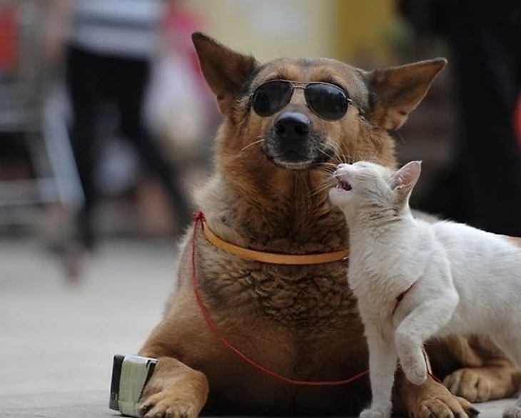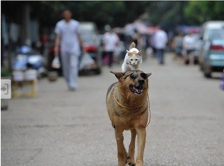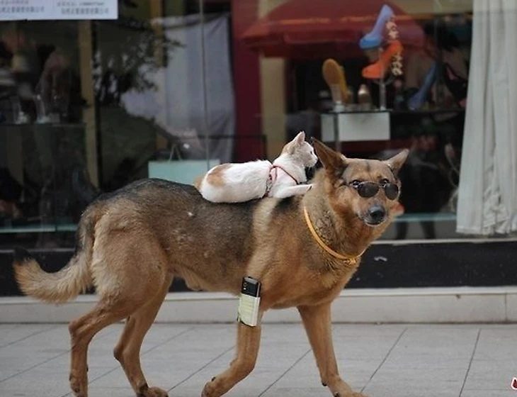 Зовут их Ванцай и Мими.Хозяин животных, 42-летний отставной полицейский Сюй Цзинь удивляется столь крепкой дружбе не меньше других. «Когда у меня появилась собака, и я начал выводить её на прогулку, кошка стала жалобно мяукать, — говорит мужчина. — Поэтому я купил поводок и стал брать её тоже. Вскоре, однако, кошка начала уставать и быстро поняла, что гораздо проще ехать на спине у собаки».