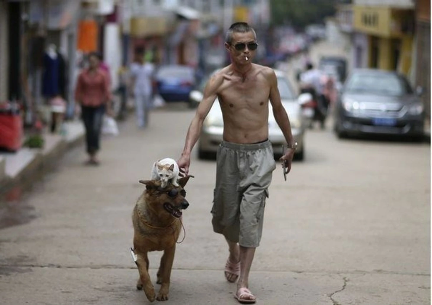 На улицах Куньмина, провинция Юньнань, можно встретить странную парочку — собаку и кошку, восседающую на товарище верхом.