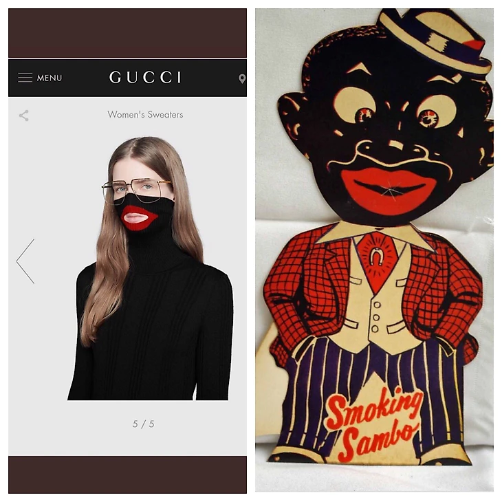 В горловине шерстяного свитера, который закрывает половину лица, есть отверстие для рта, лучшего дыхания, с красным краем, которое создает иллюзию окрашенных в красный цвет губ. Свитер должен был отдать дань уважения классическим лыжным кепкам, но многие потенциальные покупатели разразились волной критики в адрес модельера. Гуччи пришлось извиниться и снять свитер с продаж.