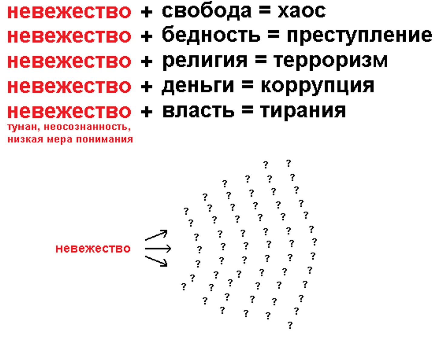 Невежество - величайший недуг и враг человечества. Невежество - корень всех зол. Невежество потому и сильно, что в нём нет сомнения.Невежественные не видят, не ощущают, не осознают свою невежественность, потому что невежественны, а невежественны из-за своей низкой меры понимания, низкой осознанности, низкого уровня нравственности, низкой силы воли, что в свою очередь сопряжено в большей степени с подверженностью различным порокам и искушениям, представленным нам (не спроста) на Земле, да ещё и в таком разнообразии.