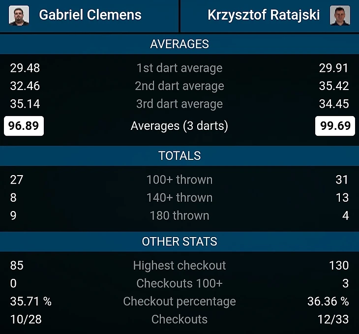 Первое в истории немецко-польское противостояние на Мэйджоре PDC. Оно получилось не просто интересным, а лучшем матчем дня! Оба дарстмена играли хорошо, а Ратайски показал лучший набор дня второй раз подряд! Такими темпами поляк может дойти очень далеко.
