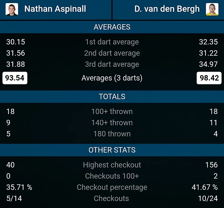 Первый матч и первая же сенсация. Из турнира вылетел сеянный под шестым номером Нэйтан Аспиналл. Многие английские болельщики возлагают на Нэйтана большие надежды, но на этот раз он их не оправдал, сыграл очень слабо и невыразительно, проиграв восходящей звезде из Бельгии ван ден Бергу. Дмитрий отыграл матч на хорошем уровне, красиво закрыл 156 и заслуженно победил.