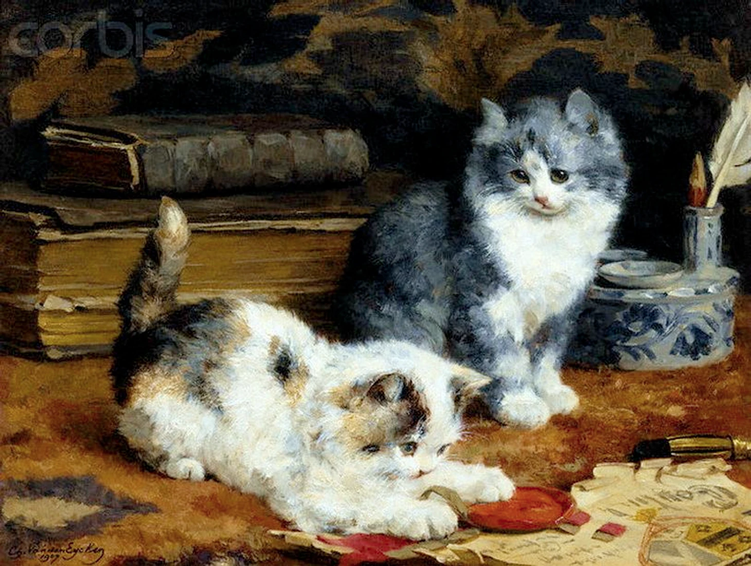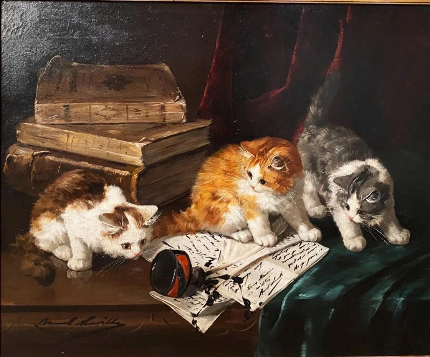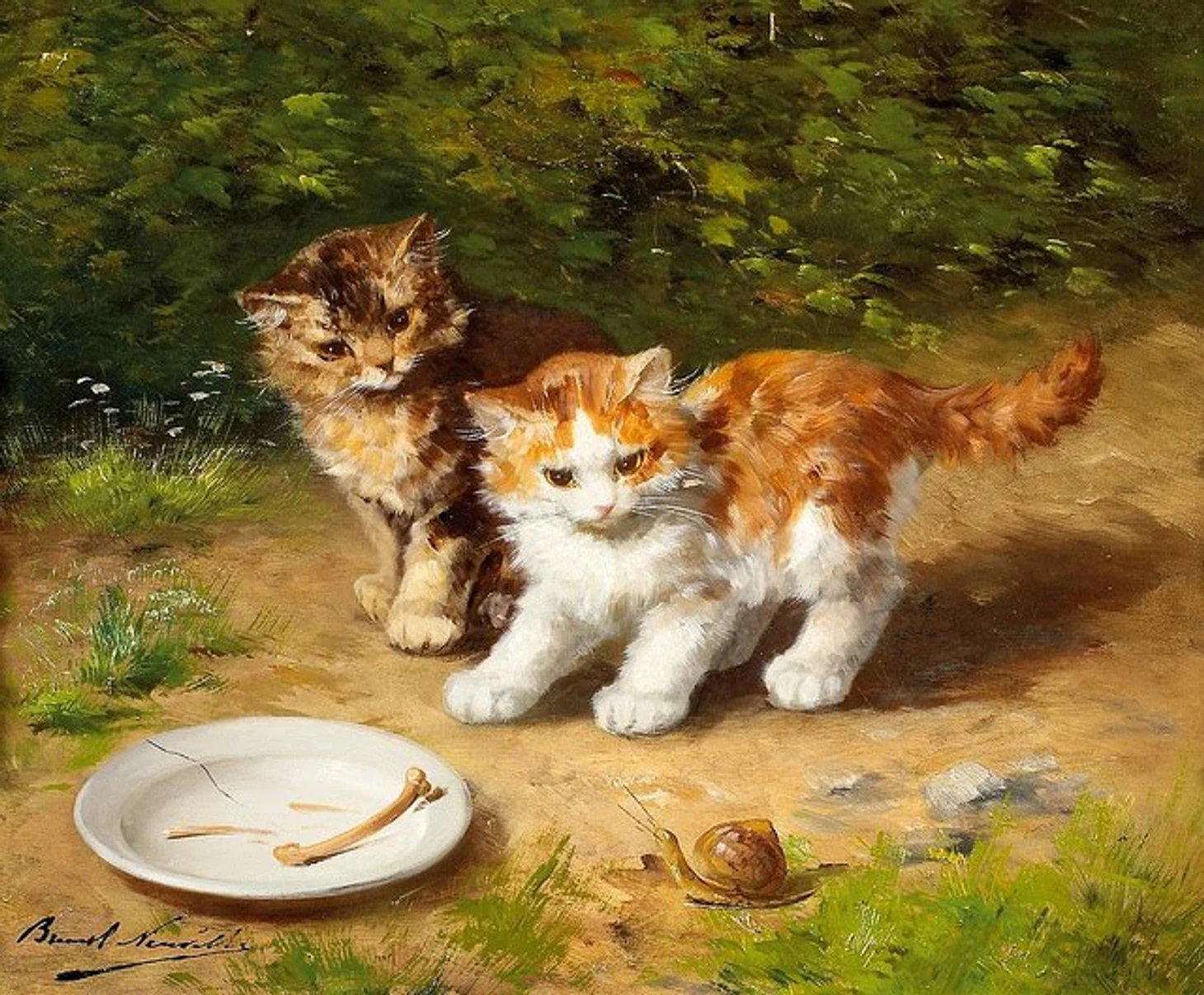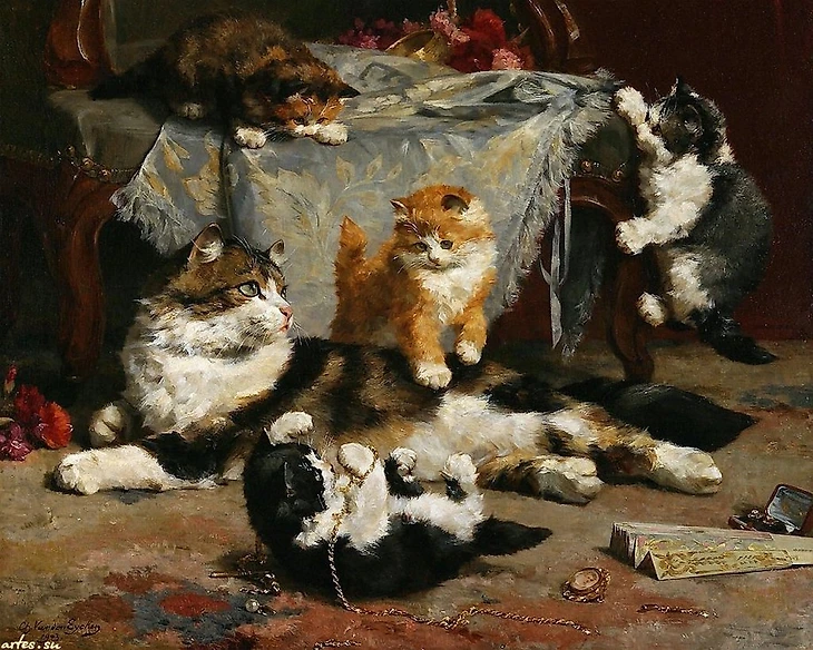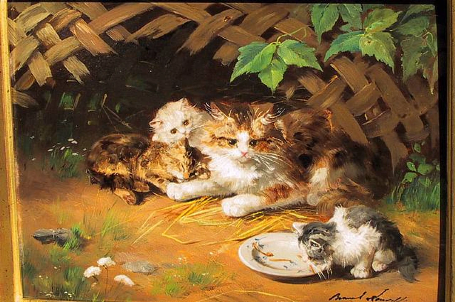 Альфред-Артур Брюнель де Нёвиль (1851-1941) - французский живописец, мастер натюрморта, анималист. Основной темой творчества были сентиментальные сценки с домашними животными. Особенной известностью пользовались работы с кошками, играющими котятами и целыми кошачьими семействами.