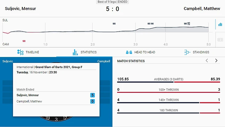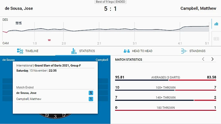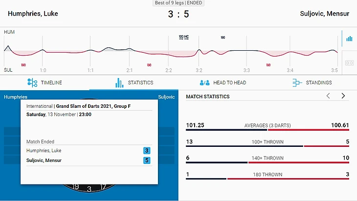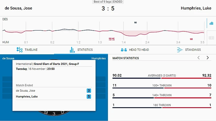 По аналогии с группой C в данной группе борьба за две путёвки шла между тремя дартсменами. В итоге Менсур Сульович при помощи уверенной сухой победы над канадцем Кемпбеллом выиграл группу, а судьба второй путёвки решалась в заключительном матче между Жозе де Соузой и Люком Хамфрисом, где Люку необходимо было побеждать с разницой в три лега. Люку не хватило одного!