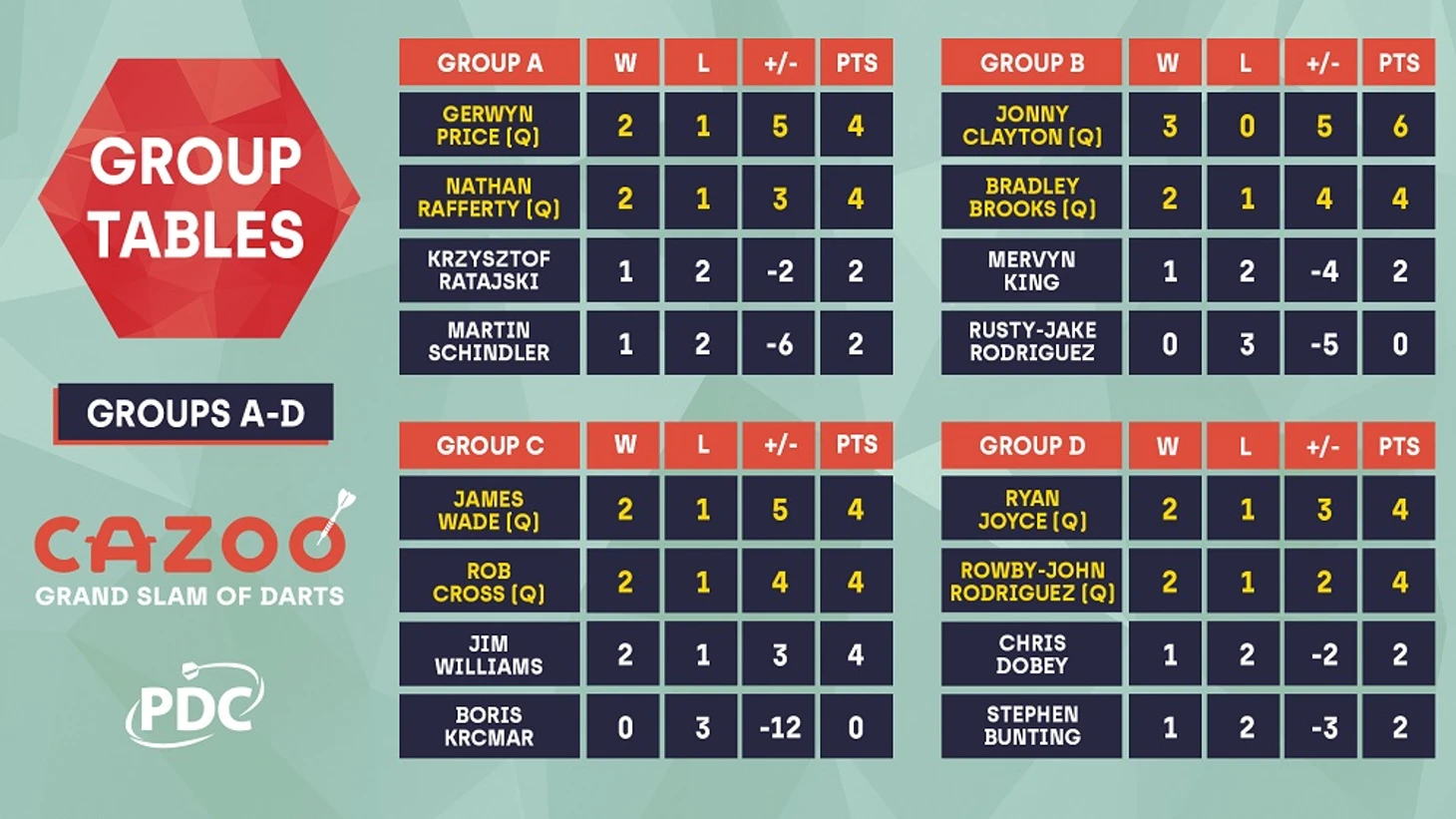 Гервин Прайс выиграл свою группу, несмотря на неожиданное поражение в последнем туре от Шиндлера. А вот второе место неожиданно занял североирландский игрок Натан Рафферти, который в очень упорном матче обыграл Кшиштофа Ратайски