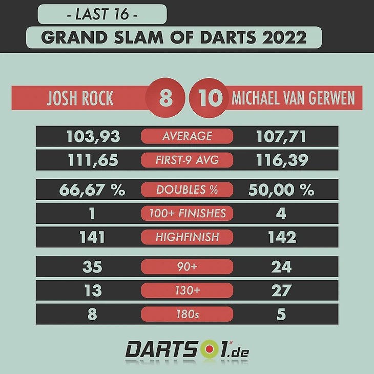 В одной из пар 1/8 финала сошлись Майкл ван Гервен и Джош Рок. Голландская лысая зелёная машина с кучей регалий и мальчишка-дебютант, который лишь в этом году стал игроком уровня PDC. На ГС Рок получил квоту как вице-чемпион молодёжного девелопмент-тура. Но при этом он уже жжёт на взрослом уровне в нетелевизионных турнирах, и пареньку прочат светлое будущее.