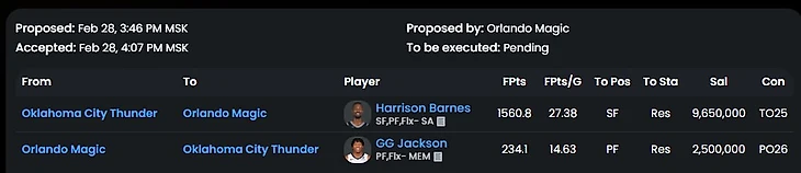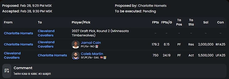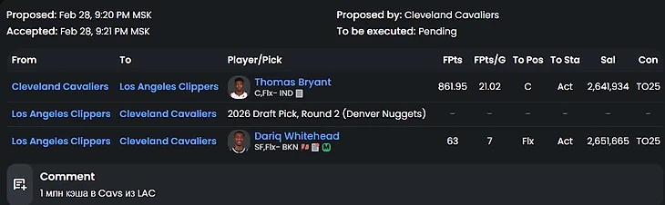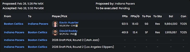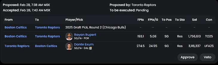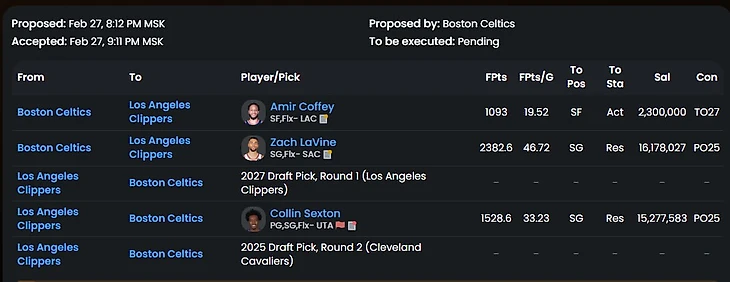 Трейд во многом похожий на реальный обмен Лавина. Бостон явно не хочет платить максималку в следующем году Заку, так еще и получает пик первого раунда. Лак же нацелены на защиту титула и подбирают сильного игрока, который проводит лучший свой сезон+ хорошего ролевика. Идеальный трейд для команд, если бы Бостон не нагрузили контрактом Секстона. А так Лак выглядит победителем в сделке (по крайне мере в рамках этого сезона).