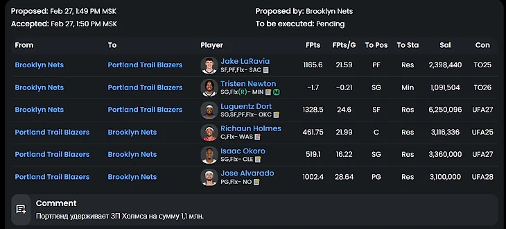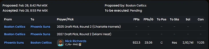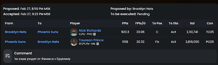 Немного странный трейд. Как будто трейд ради трейда, однако это стиль Бруклина (Прости, Макс, это твои же слова))). Финикс в дальнейшем реализует отличный контракт Ричардса. Но чем он слабее Принса? Неужели Нетс настолько был нужен кэш для других движений на рынке?