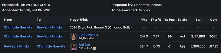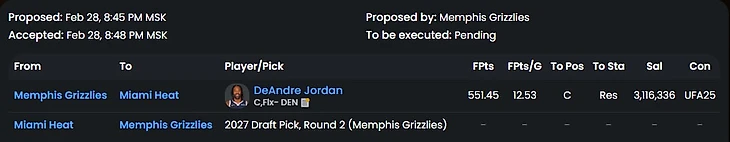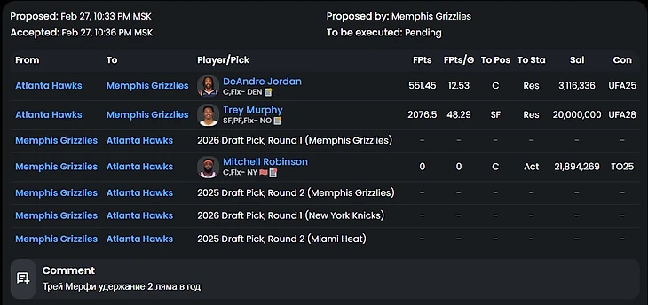 Второй ход Мемфиса под следующий сезон. Мерфи проводит элитный фэнтази сезон, но сможет ли он повторить свою эффективность при полностью здоровом составе пеликанов? Атланта до последнего боролась за плей-ин (и до сих пор борется, судя по другой сделке), но получила слишком уж жирное предложение от Гризлис. Интересно, выведут ли Мишки номер Митчелла Робинсона из обращения?