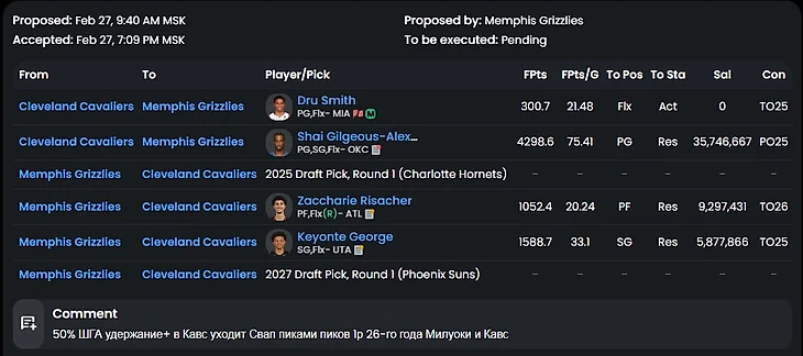 Главная бомба последних дней трансферного окна: Шай в Мемфисе! Владелец Кливленда разочаровался в своем текущем ростере и устроил распродажу. Главный лот - будущий МВП (как минимум среди игроков, которые никогда бы не сыграли за Индиану и питерский Зенит).Хорошая сделка для обоих коллективов, Мемфис еще до драфта нашел для себя главную звезду команды, а Кавс получили необходимые активы. Ждем продление контракта Шая и Мемфис в борьбе за титул в следующем году.