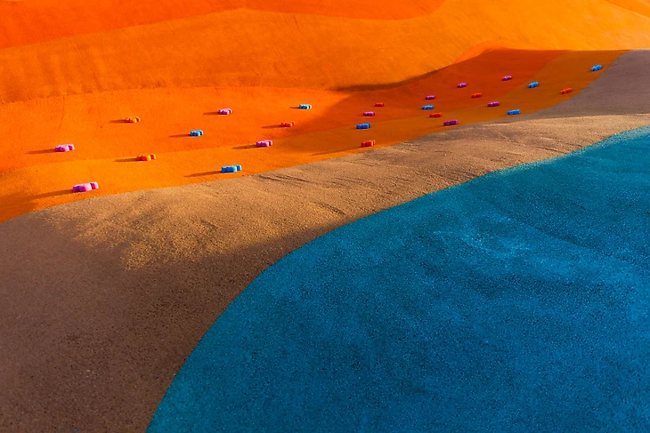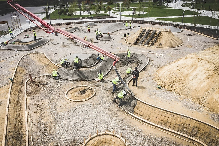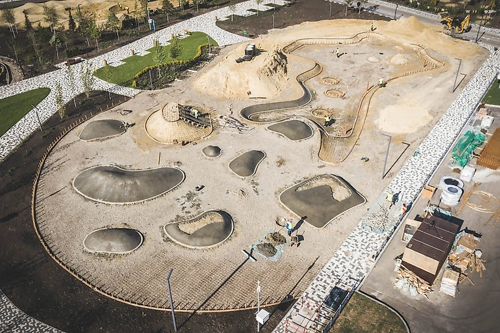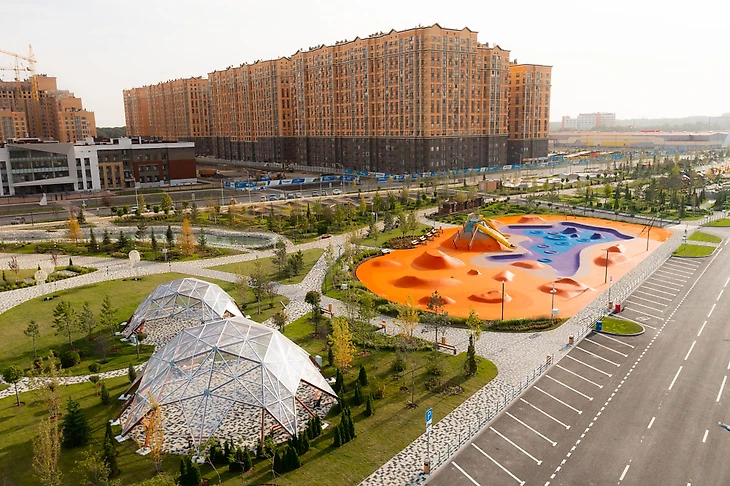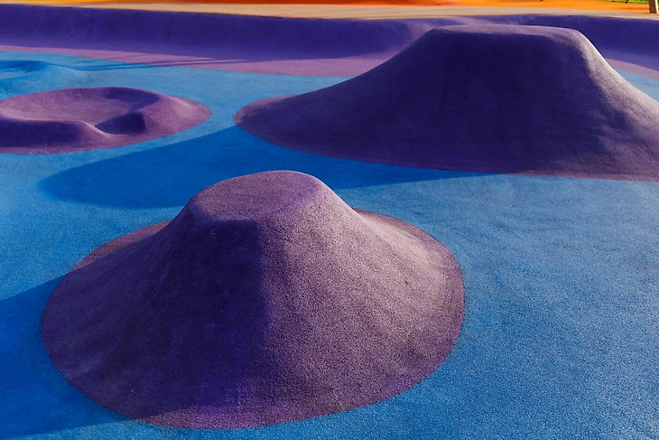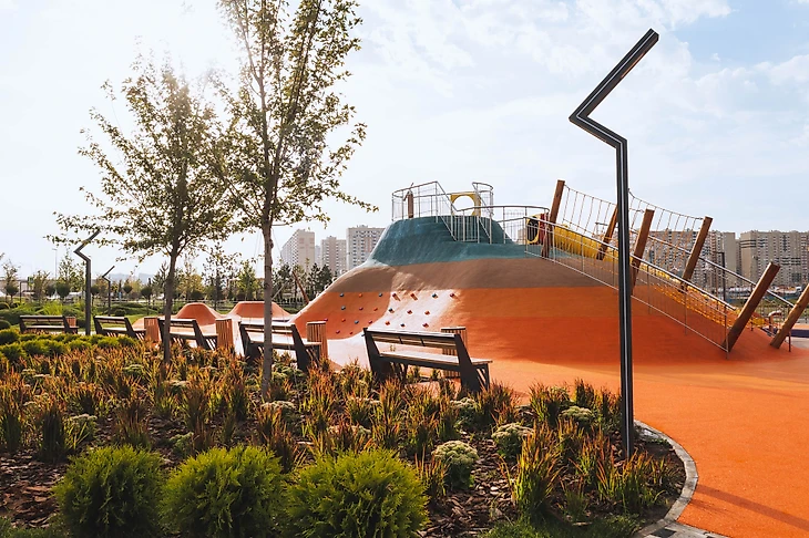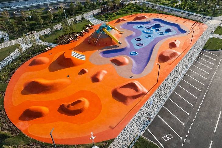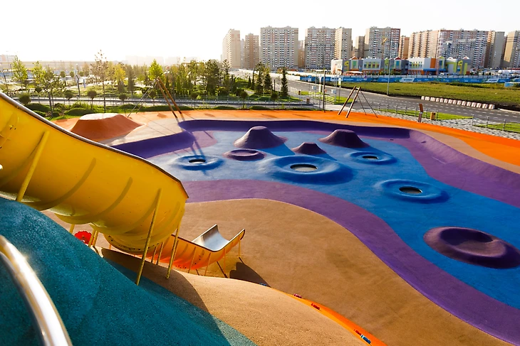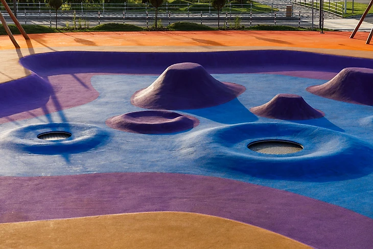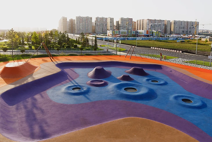 В парке на бульваре Щипакина собраны разные участки России, и детская зона была назначена Камчаткой. Наша задача была сделать что-то, напоминающее вулканы, гейзеры, сопки и другие объекты в этой стилистике. В итоге мы создали нелинейное пространство с целой россыпью разных форм, на склонах которых все желающие могут кувыркаться, скатываться с горок, прыгать внутри кратеров-батутов, но главное – придумывать свою игру.