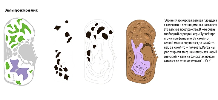 Каждая кочка может быть чем угодно: можно обнаружить настоящий вулкан и совершить восхождение, можно перемещаться между островами, можно скрыться в тени сопки; прятки, догонялки, экспедиция – количество сценариев ограничено только фантазией участников. И именно это и было нашей собственной главной задачей – не перенасыщать объекты функционалом, чтобы оставить пространство для воображения – главной супер силы всех детей.