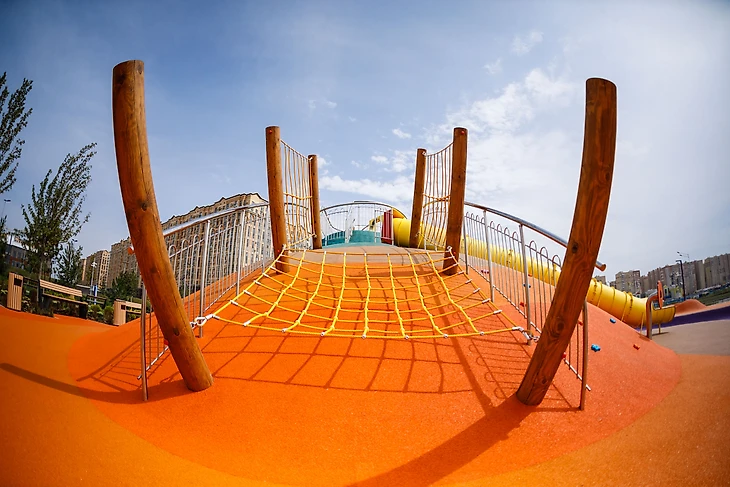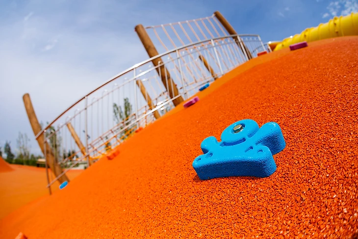 На склонах самой большой горы – массивные горки, стенки для скалолазания, металлические грибы и веревочные сетки. Десятки разных фактур и фигур позволяют детям испытывать широкий спектр тактильных ощущений и знакомиться с миром через осязание и игры.