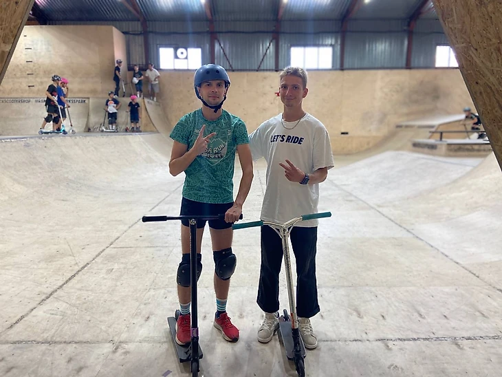 Я захожу на территорию крытого скейт-парка на Нагорной. Время — 13:00. Меня встречает Стас — невысокий парень в спортивной форме и кедах. Мы надеваем шлем и наколенники, берем самокаты и начинаем тренировку.