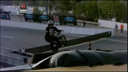 Сначала вращается только бмх - bike flip, потом вращается все вместе - backflip, потом вращается рама вокруг руля tailwip. 3 последовательных трюка. Соревнования X-Games.