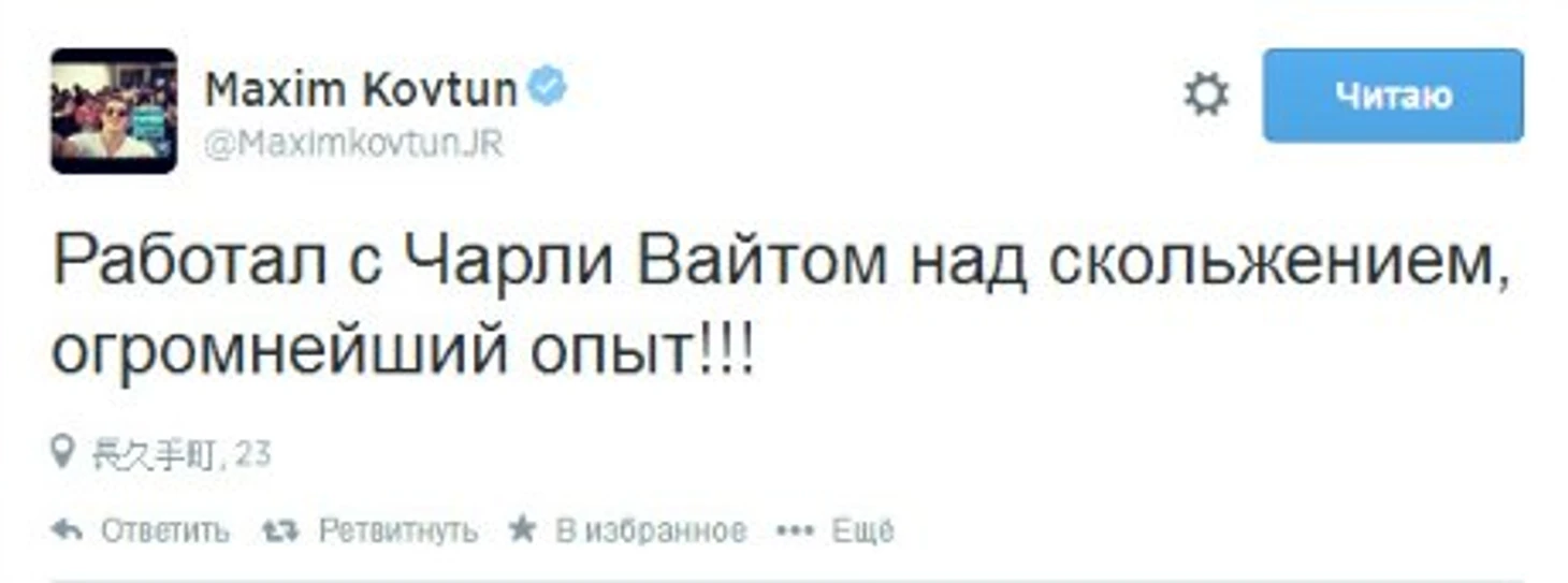«Работал с Чарли Уайтом над скольжением, огромнейший опыт!» – написал Ковтун в своем твиттере.