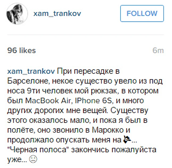 «При пересадке в Барселоне некое существо увело из под носа девяти человек мой рюкзак, в котором был MacBook Air, IPhone 6S и много других дорогих мне вещей», – написал Траньков.