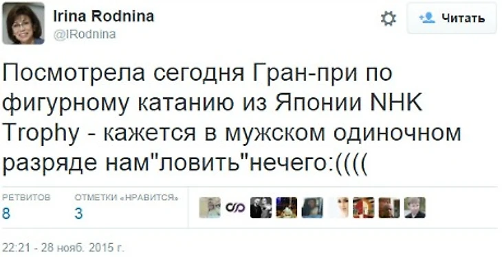 «Посмотрела сегодня Гран-при по фигурному катанию NHK Trophy. Кажется, в мужском одиночном разряде нам ловить нечего», – написала Роднина.