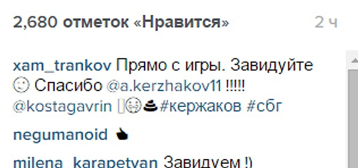 «Прямо с игры. Завидуйте. Спасибо, Александр Кержаков», – написал Траньков.