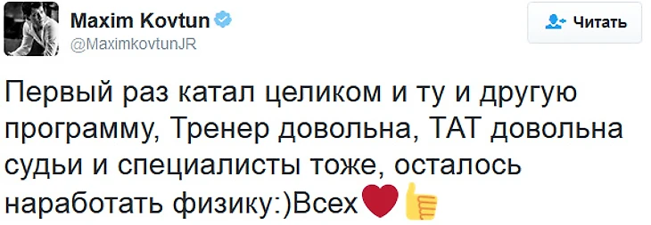 «Первый раз катал целиком и ту, и другую программу. Тренер довольна, Татьяна Анатольевна Тарасова довольна, судьи и специалисты тоже. Осталось наработать физику», – написал Ковтун.
