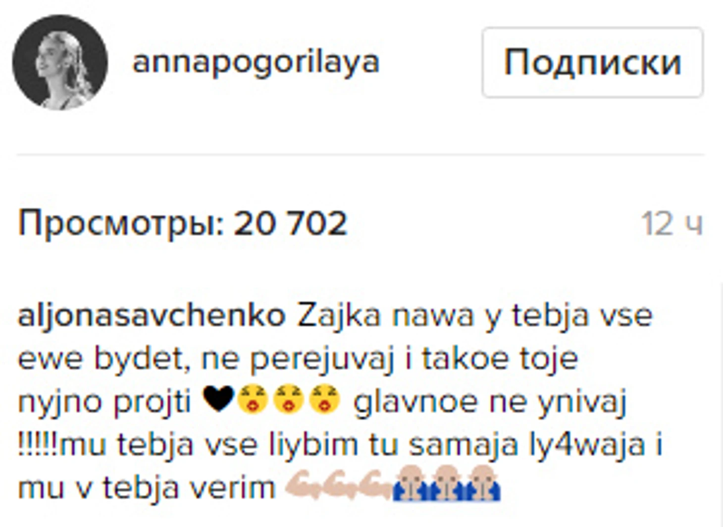 «Зайка наша, у тебя все еще будет. Не переживай, и такое тоже нужно пройти. Главное – не унывай! Мы все тебя любим, ты самая лучшая, и мы в тебя верим», – написала Савченко в комментариях в инстаграме Погорилой.