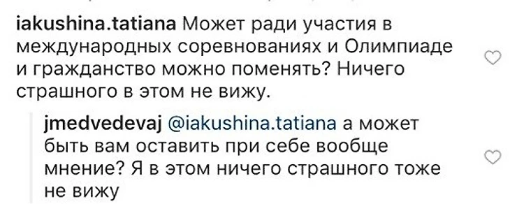 «Может, ради участия в международных соревнованиях и Олимпиаде и гражданство можно поменять? Ничего страшного в этом не вижу», – написали фигуристке в инстаграме.