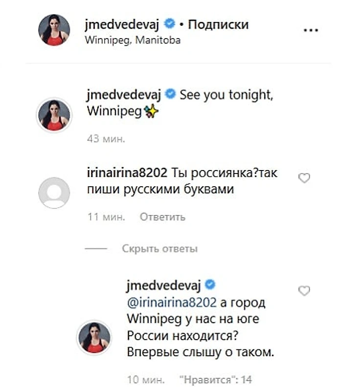 Медведева ответила болельщику, упрекнувшему ее в анонсе шоу на английском: «Впервые слышу, что Winnipeg на юге России»