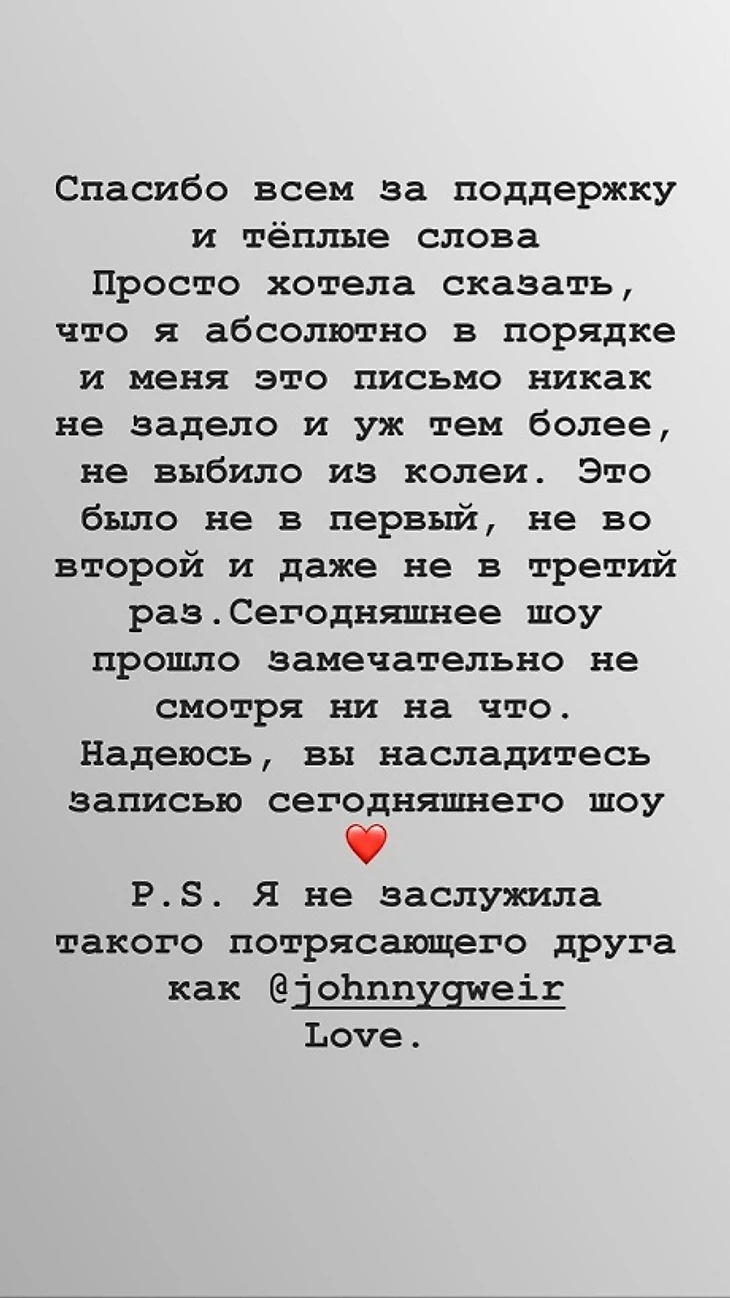 «Спасибо всем за поддержку и теплые слова. Просто хотела сказать, что я абсолютно в порядке и меня это письмо никак не задело и уж тем более не выбило из колеи.