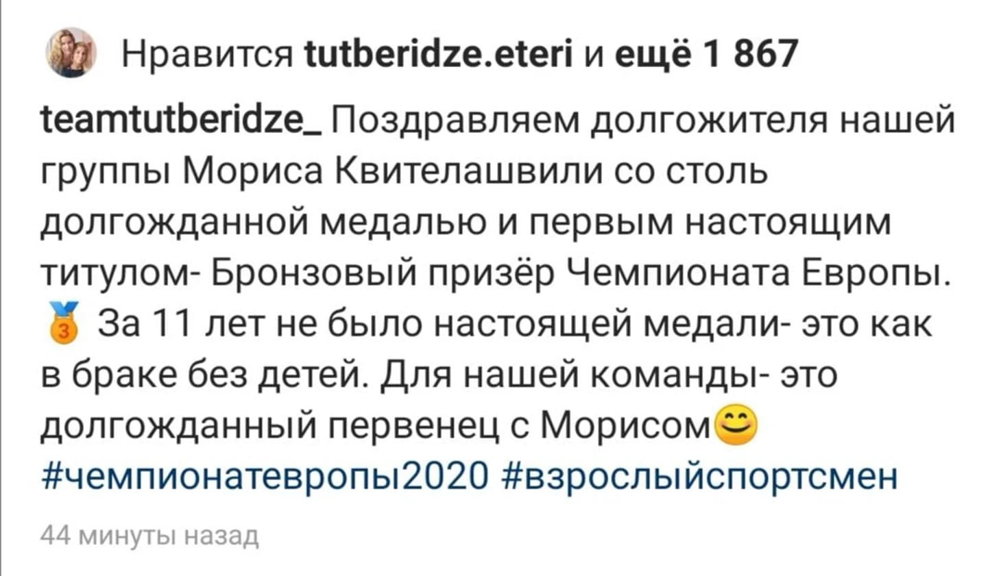 За 11 лет не было настоящей медали – это как в браке без детей (только настоящие чувства удерживают людей вместе). Для нашей команды это долгожданный первенец с Морисом», – говорится в поздравлении, которое заканчивается хэштегами #чемпионатевропы2020 и #взрослыйспортсмен. Изначально в посте не было предложения про чувства, которые удерживают людей вместе.