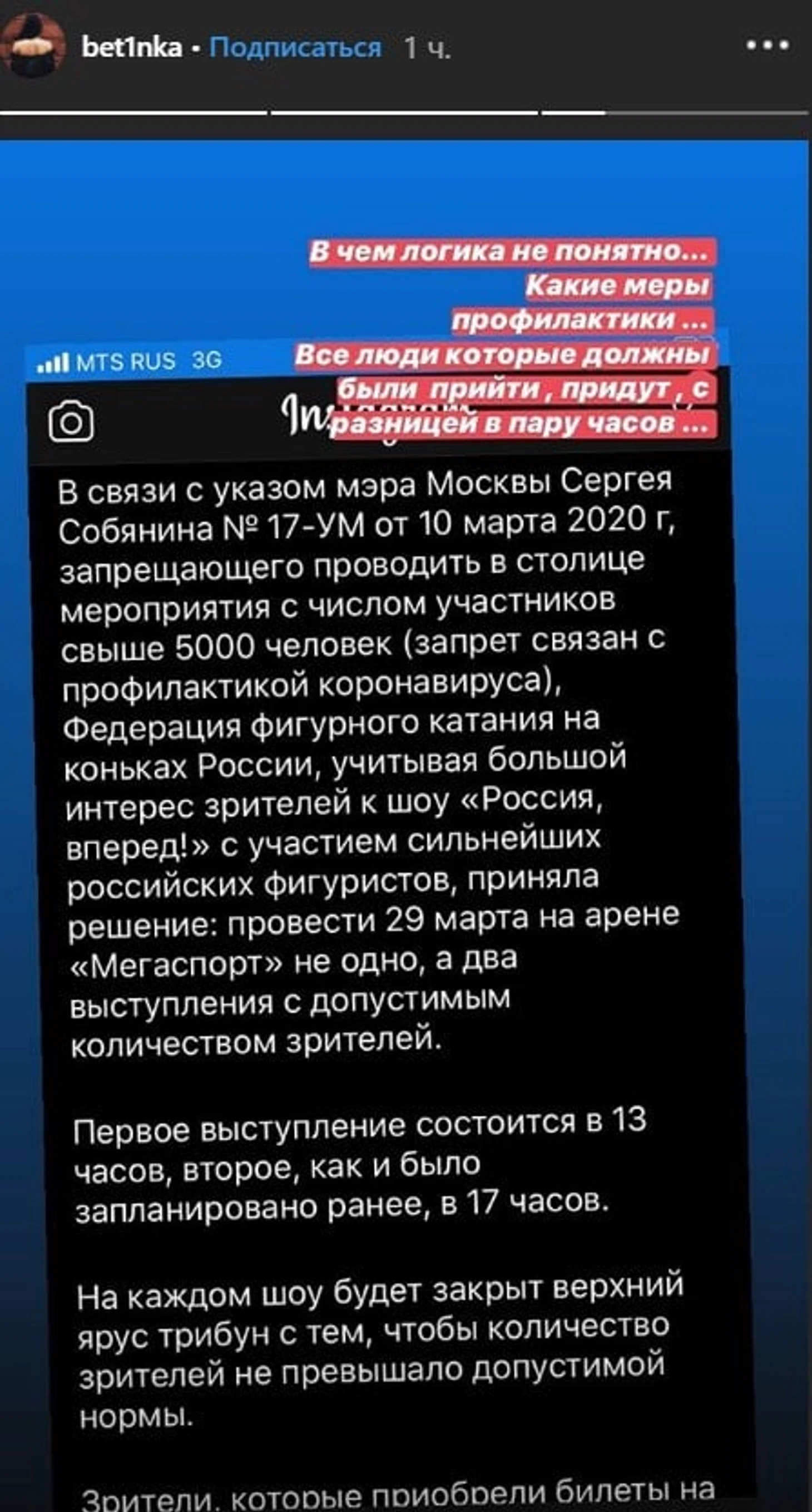 Российская фигуристка Бетина Попова прокомментировала меры, принятые организаторами шоу «Россия, вперед!» в Москве в связи с ограничением числа зрителей из-за коронавируса.