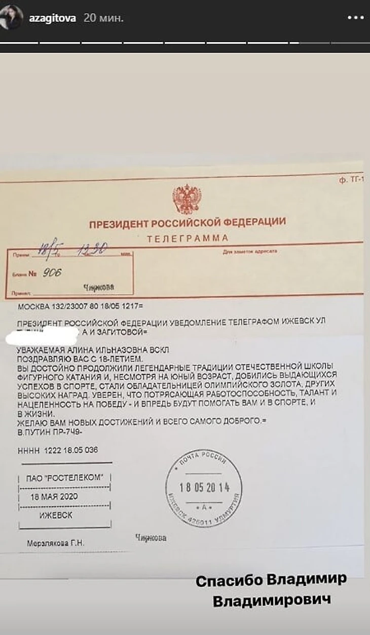 «Спасибо, Владимир Владимирович», – написала Загитова в инстаграме.