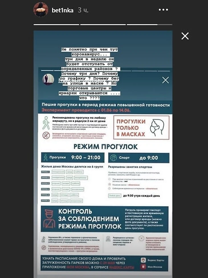 Фигуристка Попова о графике прогулок в Москве: «При чем тут коронавирус? Три дня в неделю он будет отступать?»