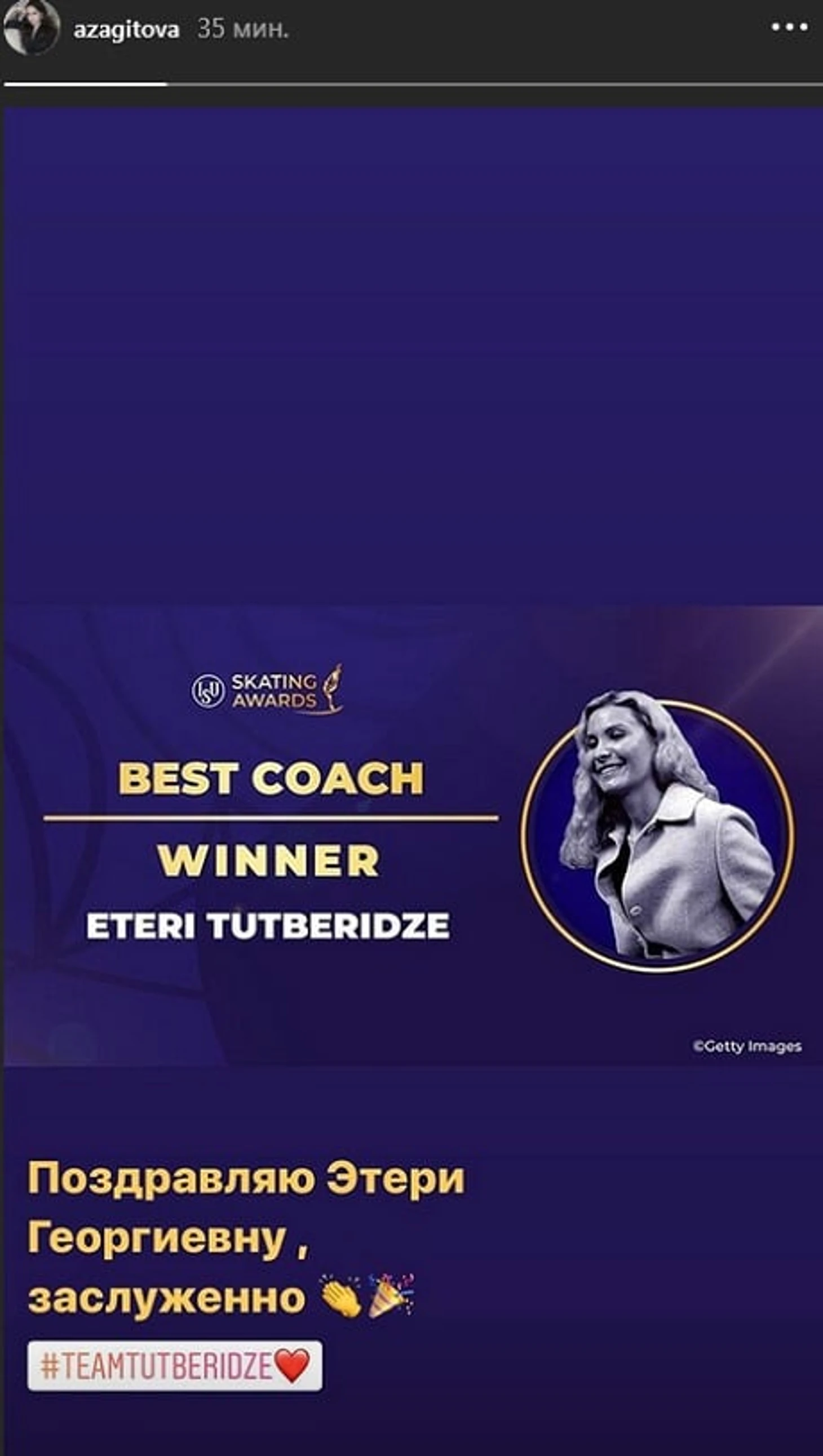 Олимпийская чемпионка Алина Загитова поздравила Этери Тутберидзе с победой на премии ISU Skating Awards в номинации «Лучший тренер».