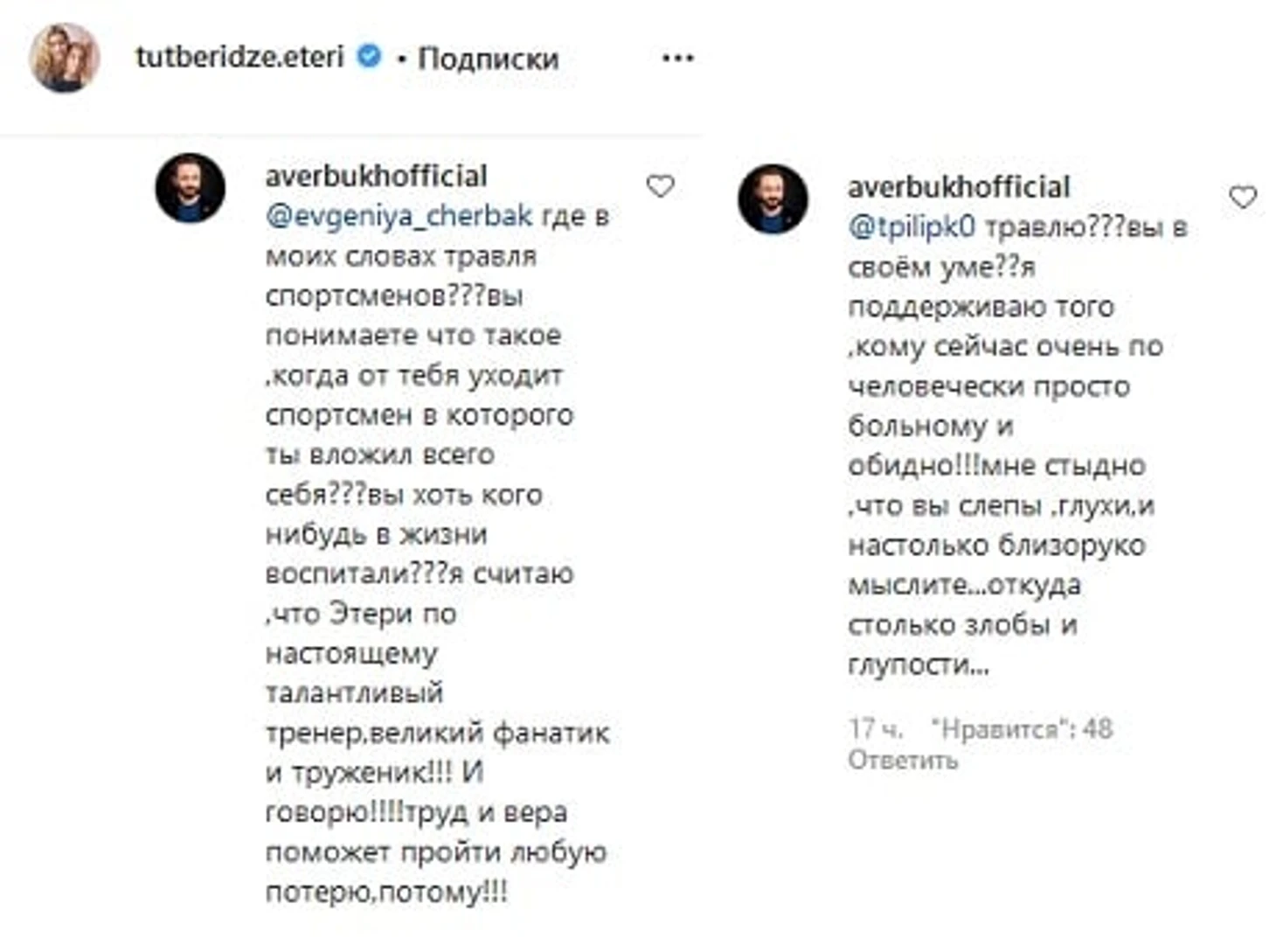 «Труженикам всегда воздается пришедшим за тем успехом, и, к сожалению, и «воздается» такими пощечинами от самых близких... Но труженик-созидатель всегда будет первым... всегда!!!» – написал Авербух в инстаграме Тутберидзе.
