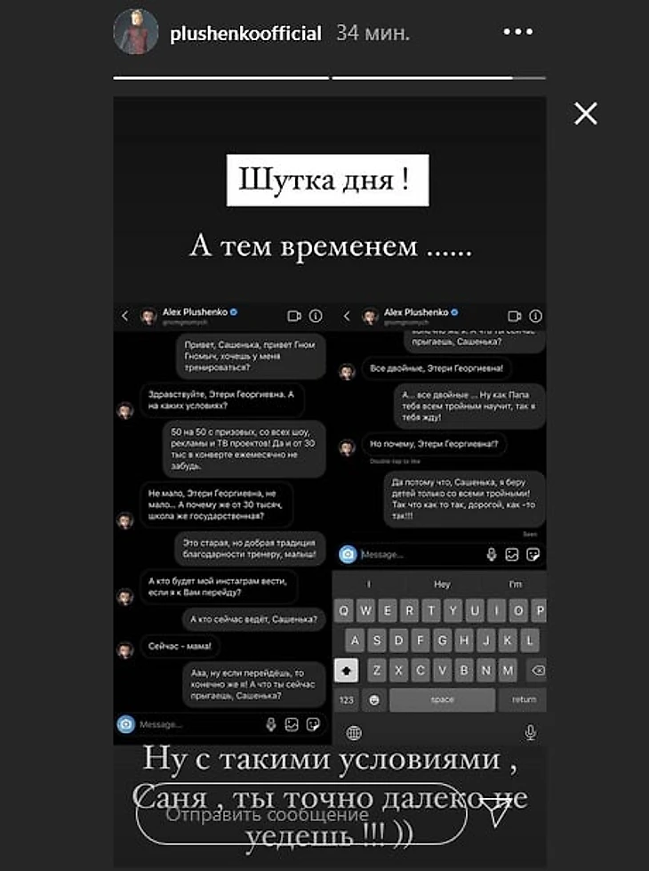 «Шутка дня! Ну с такими условиями, Саня, ты точно далеко не уедешь», – написал Плющенко.