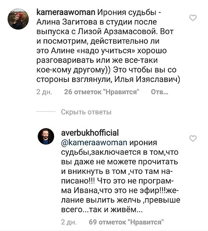 «Ирония судьбы – Алина Загитова в студии после выпуска с Лизой Арзамасовой. Вот и посмотрим, действительно ли Алине «надо учиться» хорошо разговаривать или же все-таки кое-кому другому. Это чтобы вы со стороны взглянули, Илья Изяславич», – написала Авербуха подписчица.