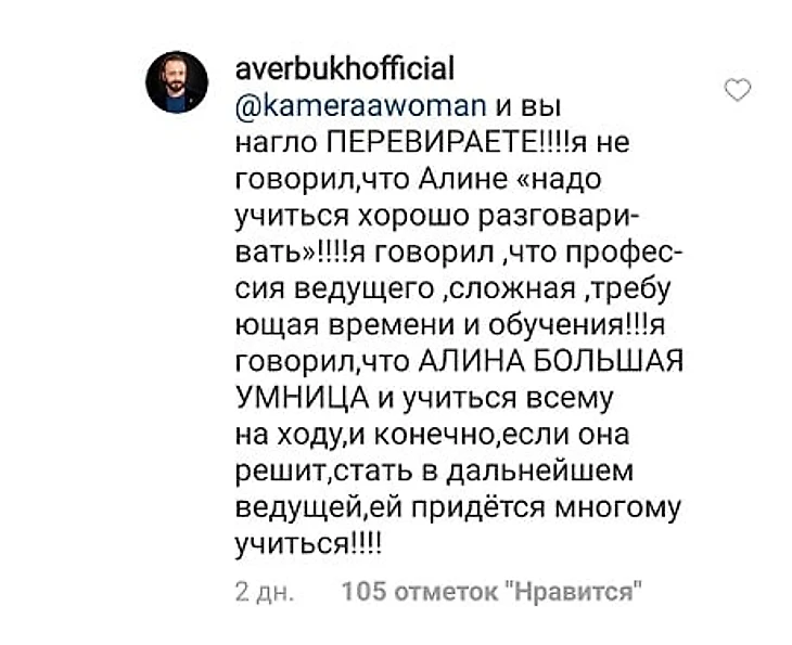 «И вы нагло перевираете! Я не говорил, что Алине «надо учиться хорошо разговаривать»! Я говорил, что профессия ведущего сложная, требующая времени и обучения!