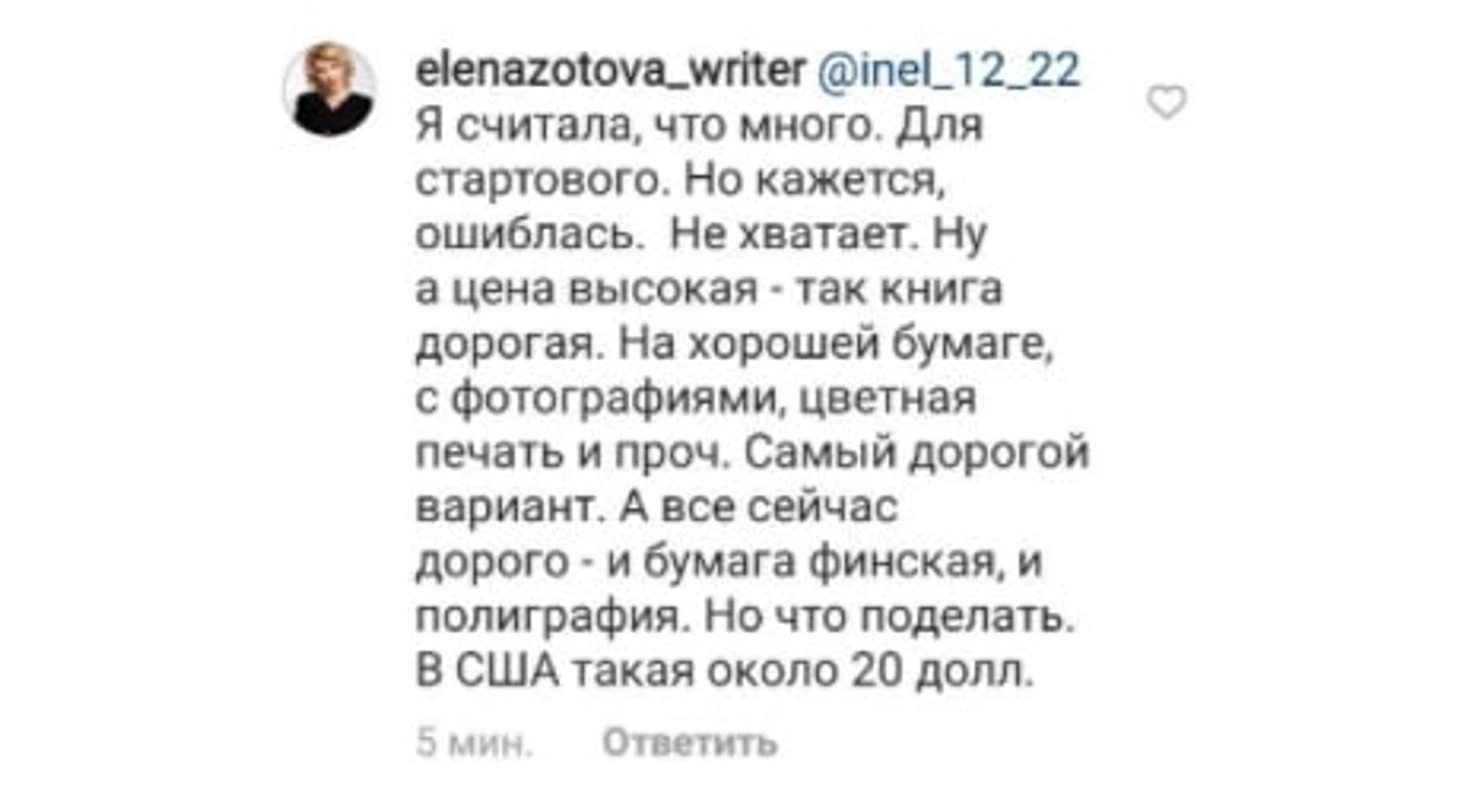Стоимость – около 600 рублей. Ну а цена высокая – так книга дорогая. На хорошей бумаге, с фотографиями, цветная печать и прочее. Самый дорогой вариант. А все сейчас дорого – и бумага финская, и полиграфия. Но что поделать. В США такая – около 20 долларов», – написала Зотова в инстаграме Sports.ru о фигурном катании.