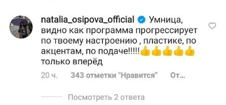 «Умница, видно, как программа прогрессирует по твоему настроению, пластике, по акцентам, по подаче! Только вперед», – написала Осипова в комментариях в инстаграме Валиевой.