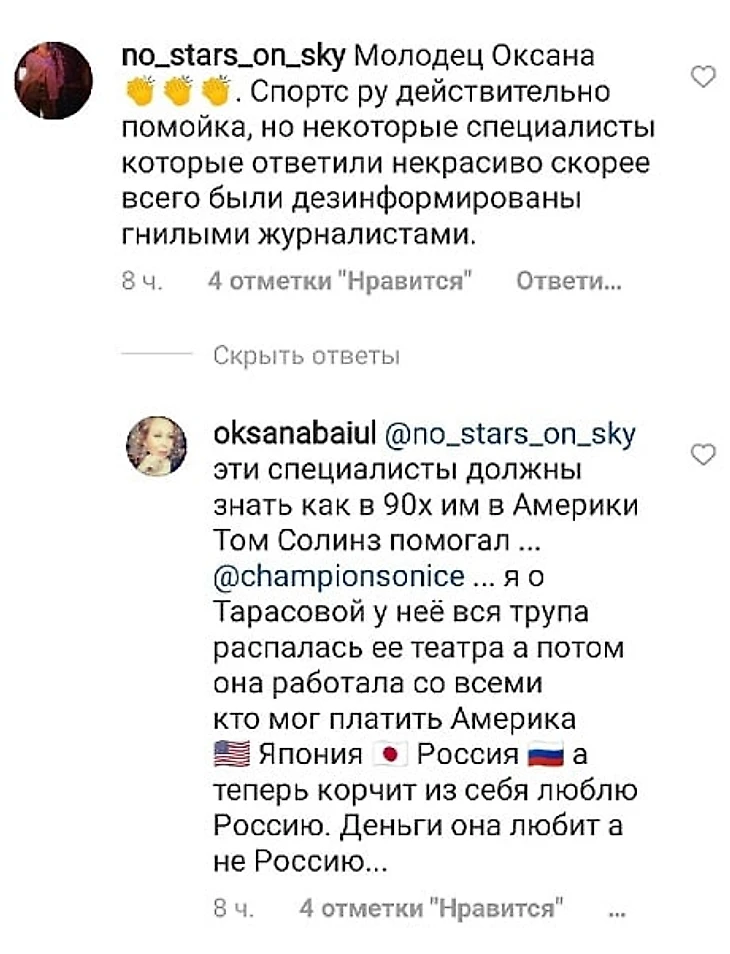 Татьяна Тарасова, комментируя критические заявления Баюл, отметила, что Оксана «и раньше безобразно высказывалась о своих коллегах».
