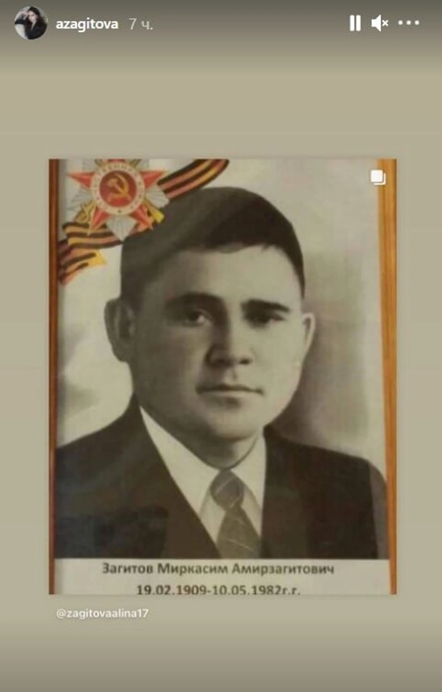 Фигуристка также опубликовала фото прадеда – ветерана войны Миркасима Загитова.