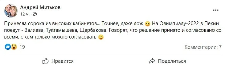 «Принесла сорока из высоких кабинетов... Точнее, даже лож. На Олимпиаду-2022 в Пекин поедут Валиева, Туктамышева, Щербакова. Говорят, что решение принято и согласовано со всеми, с кем только можно согласовать», – написал Митьков.