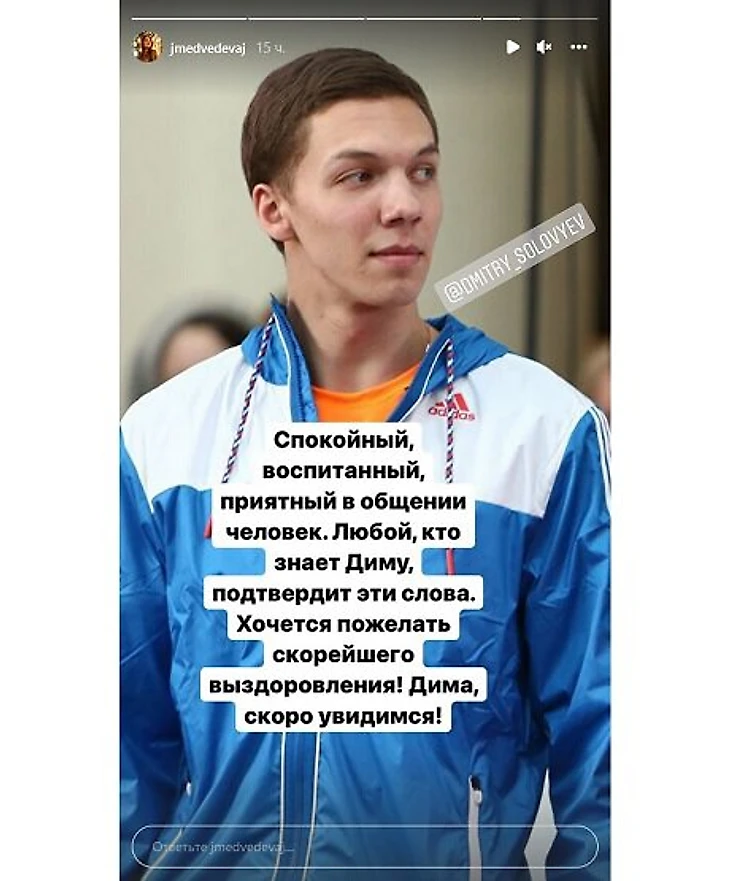 Евгения Медведева: «Соловьев – спокойный, воспитанный, приятный в общении человек. Хочется пожелать ему скорейшего выздоровления»
