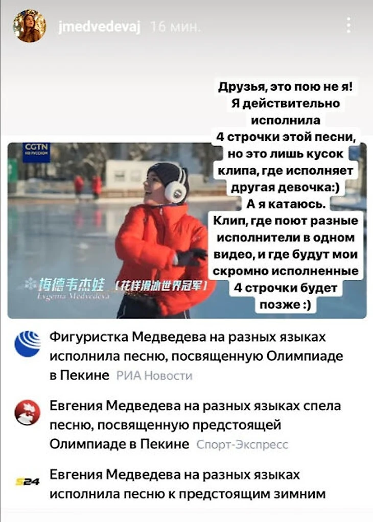Двукратная чемпионка мира по фигурному катанию Евгения Медведева сообщила, что песню в проморолике Олимпиады-2022 в Пекине исполняет не она.