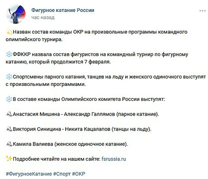 ФФКР опубликовала состав сборной на произвольные программы командного турнира Пекина-2022. Утром турнир уже завершился