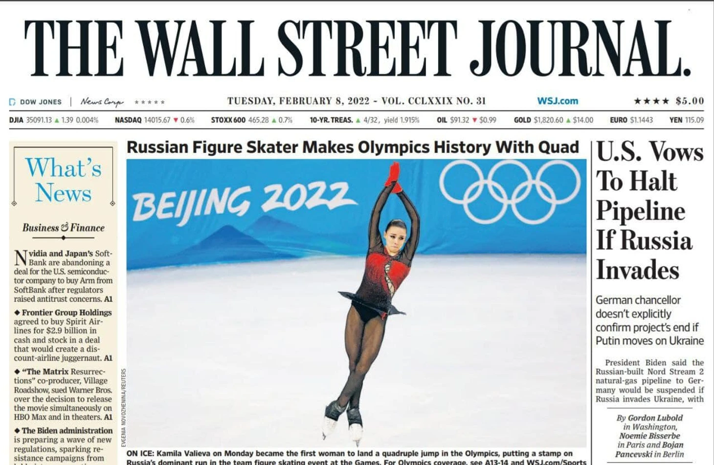 Валиева попала на первую полосу The Wall Street Journal: рядом с новостями про бизнес и реакцию Байдена в случае нападения России на Украину