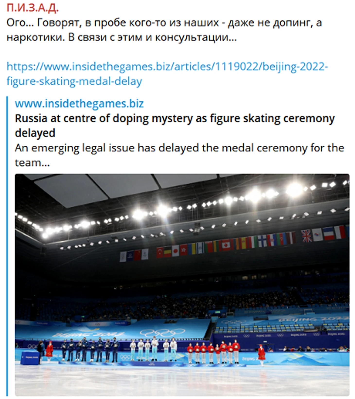 Митьков ссылается на публикацию портала Inside the games, которое ранее сообщило, что медальная церемония награждения победителей и призеров командного турнира была отложена из-за проблемы с тестированием на допинг у спортсмена из России.