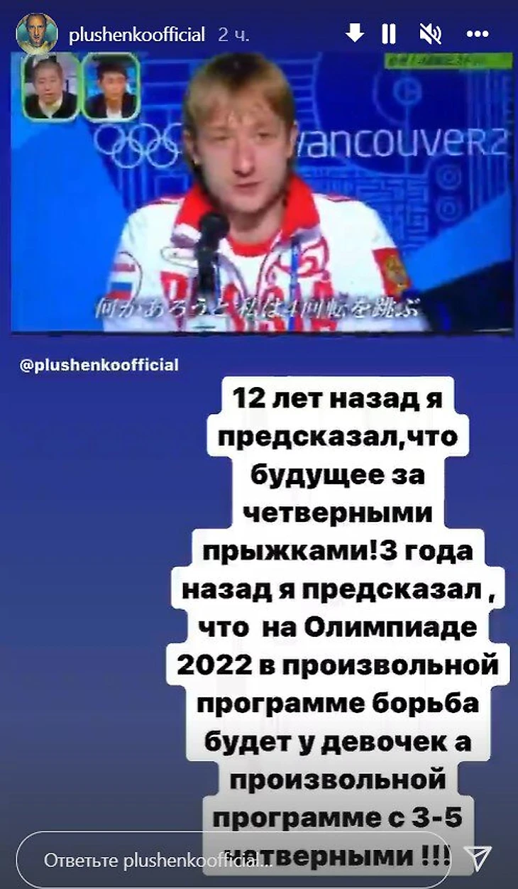 3 года назад я предсказал, что на Олимпиаде-2022 в произвольной программе борьба будет у девочек с 3-5 четверными!» – написал Плющенко.