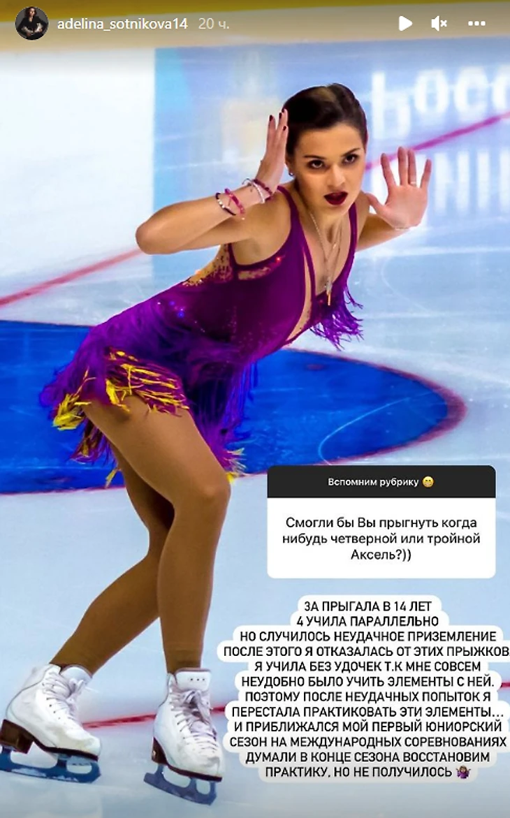 • Аделина Сотникова: «Тройной аксель прыгала в 14 лет, четверной учила параллельно. Но случилось неудачное приземление, после этого отказалась от этих прыжков»