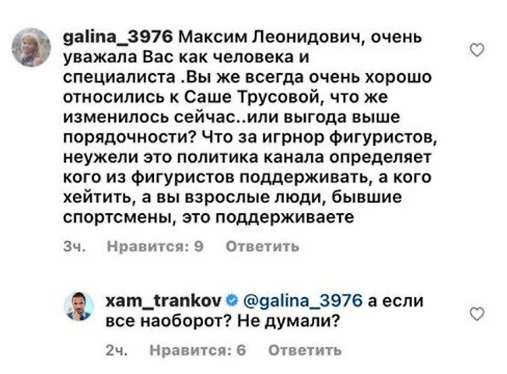 «Что за игнор фигуристов, неужели это политика канала определяет, кого из фигуристов поддерживать, а кого хейтить? А вы, взрослые спортсмены, это поддерживаете», – написала еще одна болельщица.